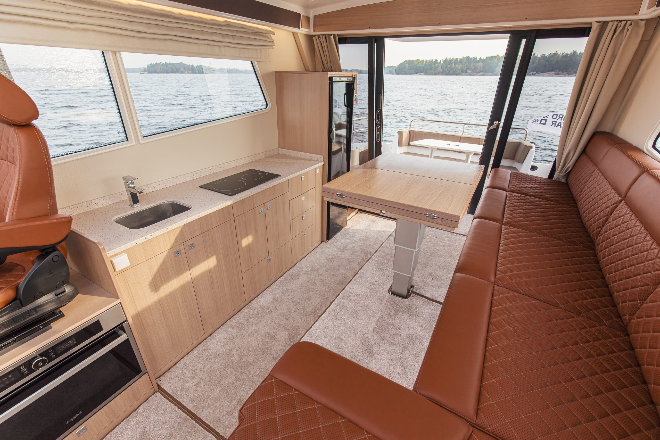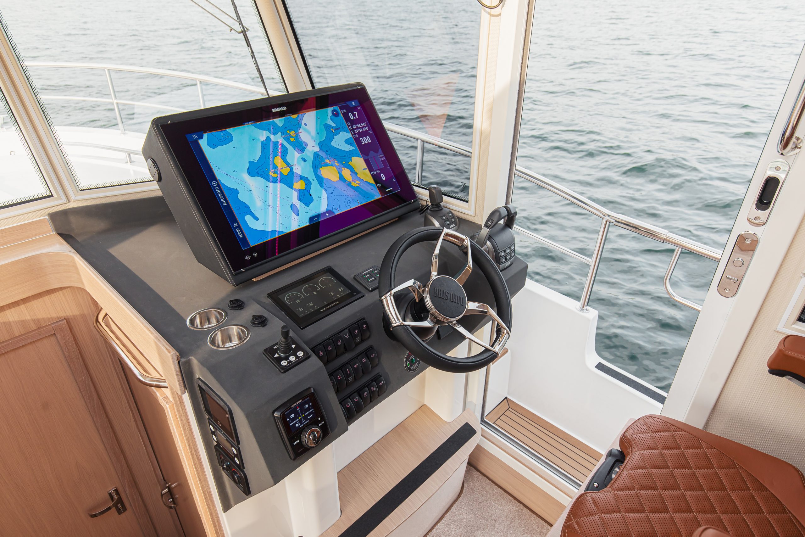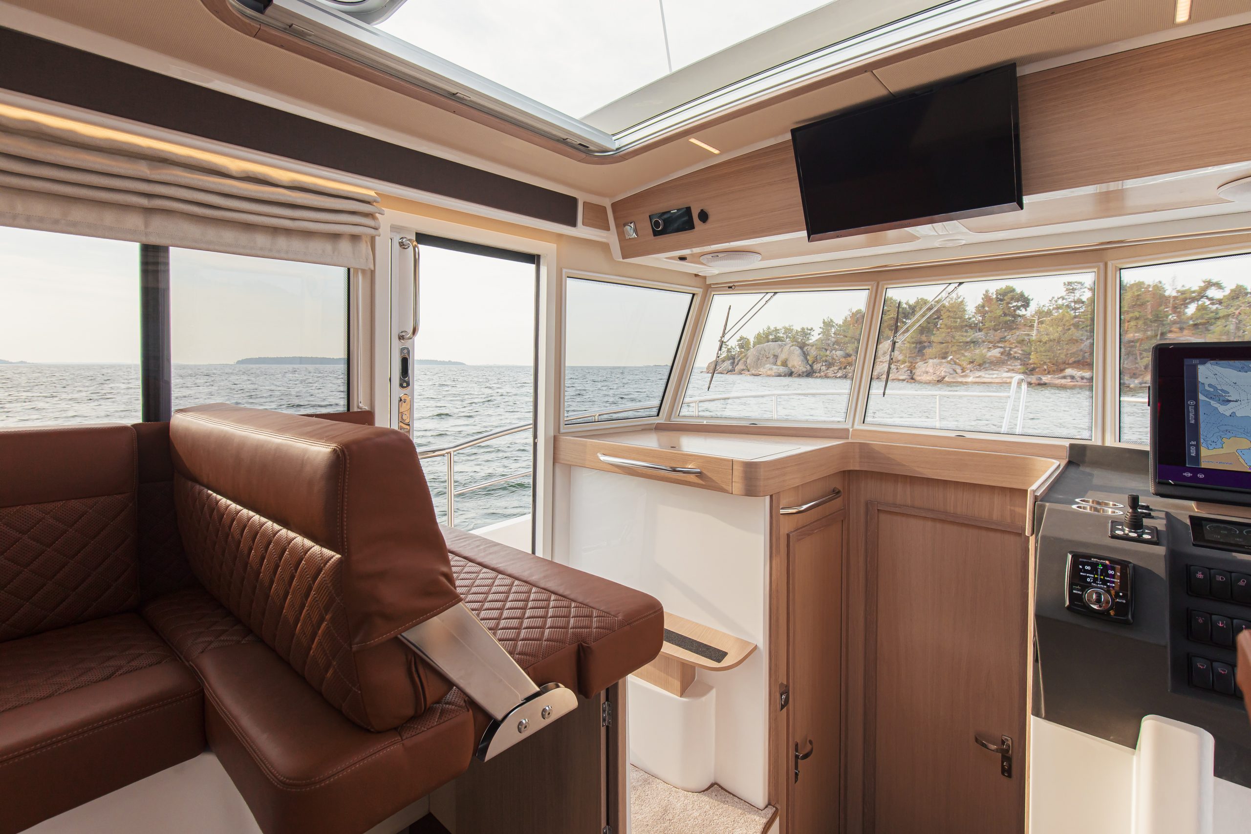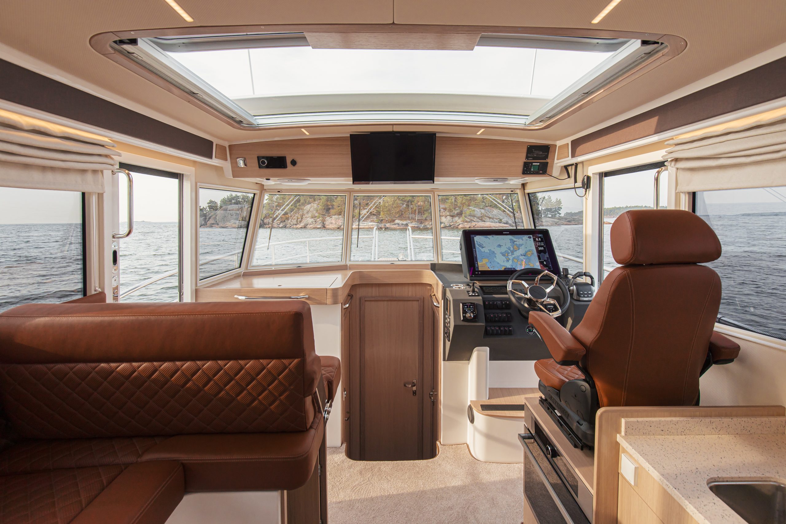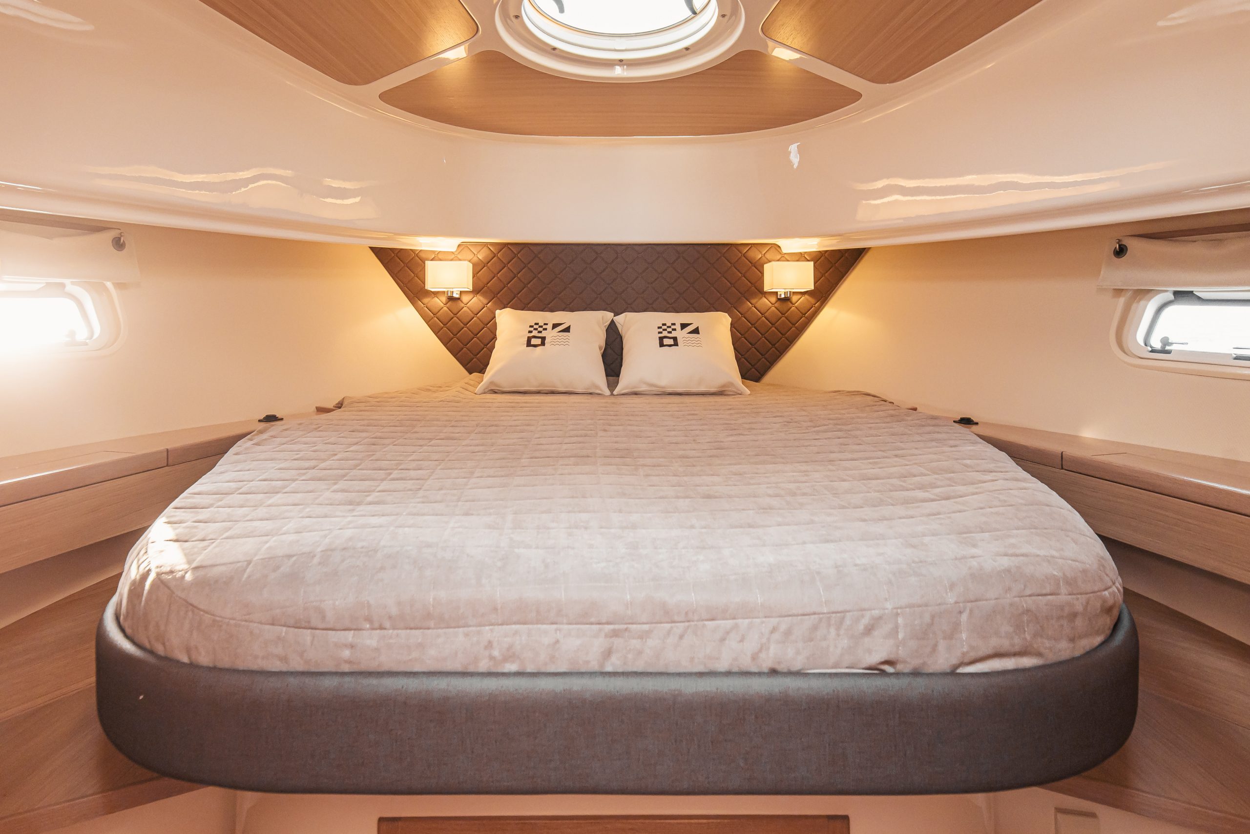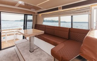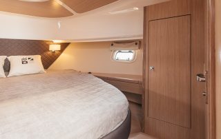 Das geräumige Achterdeck mit Sitzgelegenheiten und abnehmbarem Tisch bietet großzügigen Platz für Entspannung und Unterhaltung. Das Walkaround-Deck mit Handläufen sorgt für eine sichere und ungehinderte Bewegung rund um das Boot auf See oder in der Marina. Die Flybridge-Option bietet zusätzlichen Spaß während der Fahrt und weiteren unterhaltsamen Raum.
