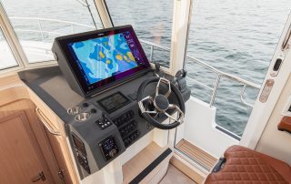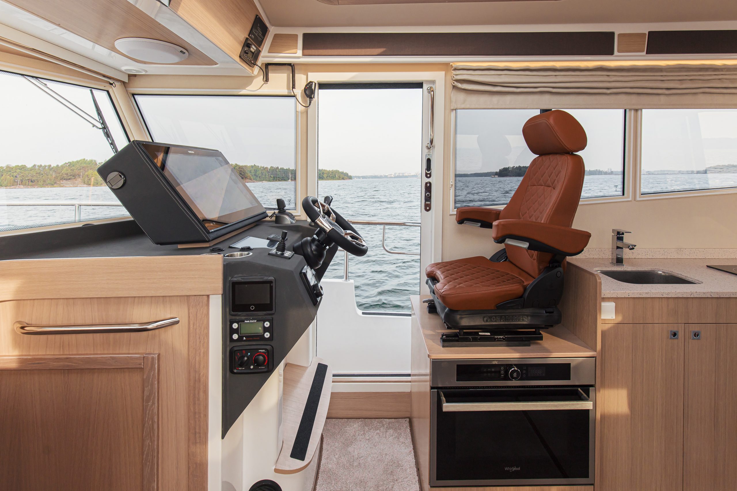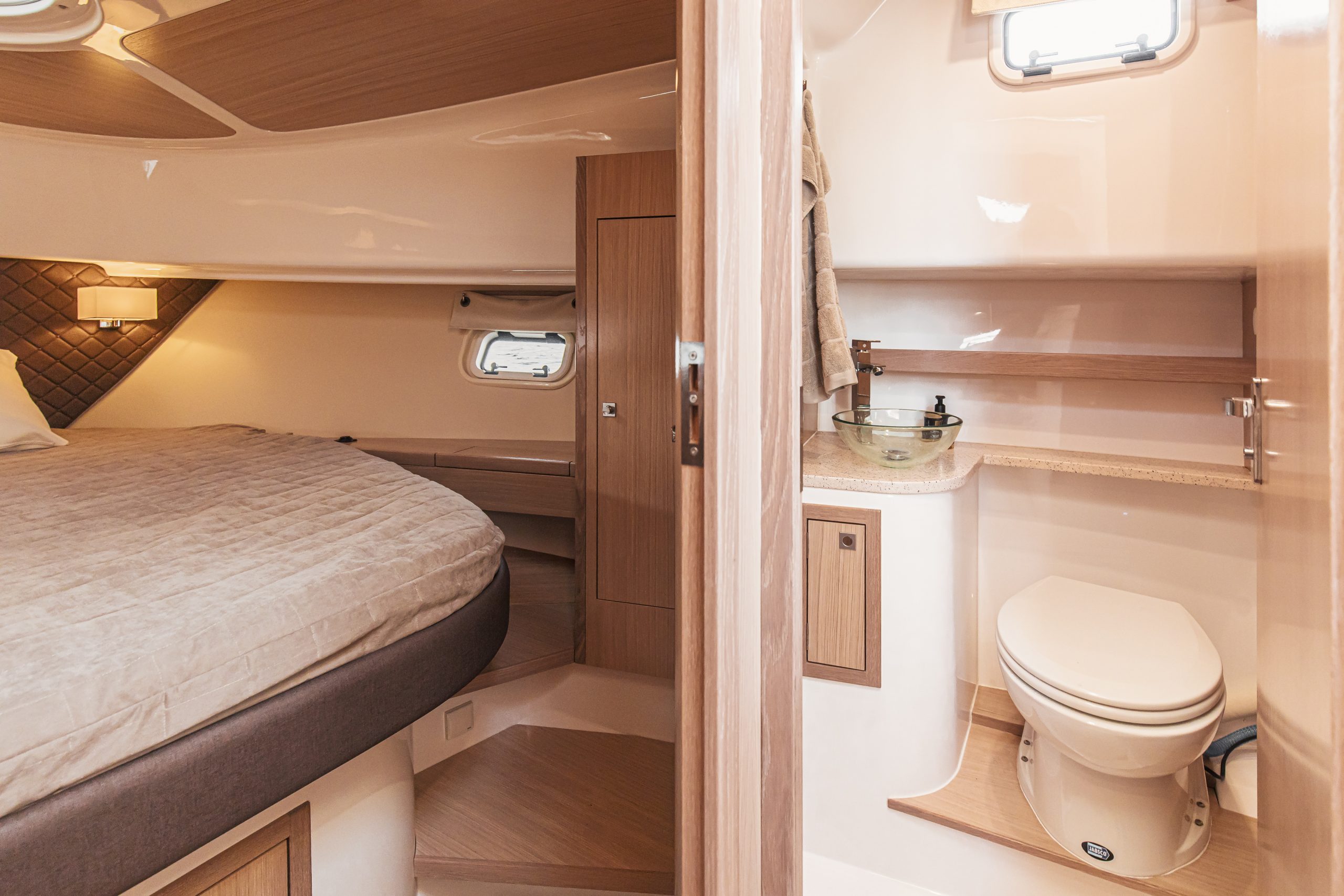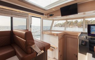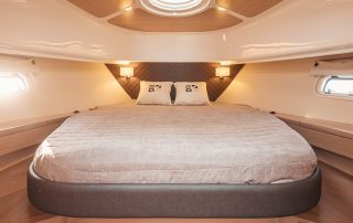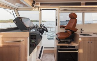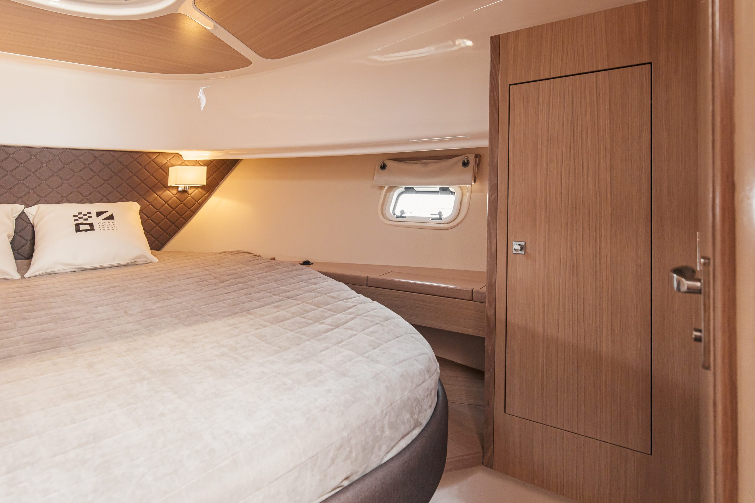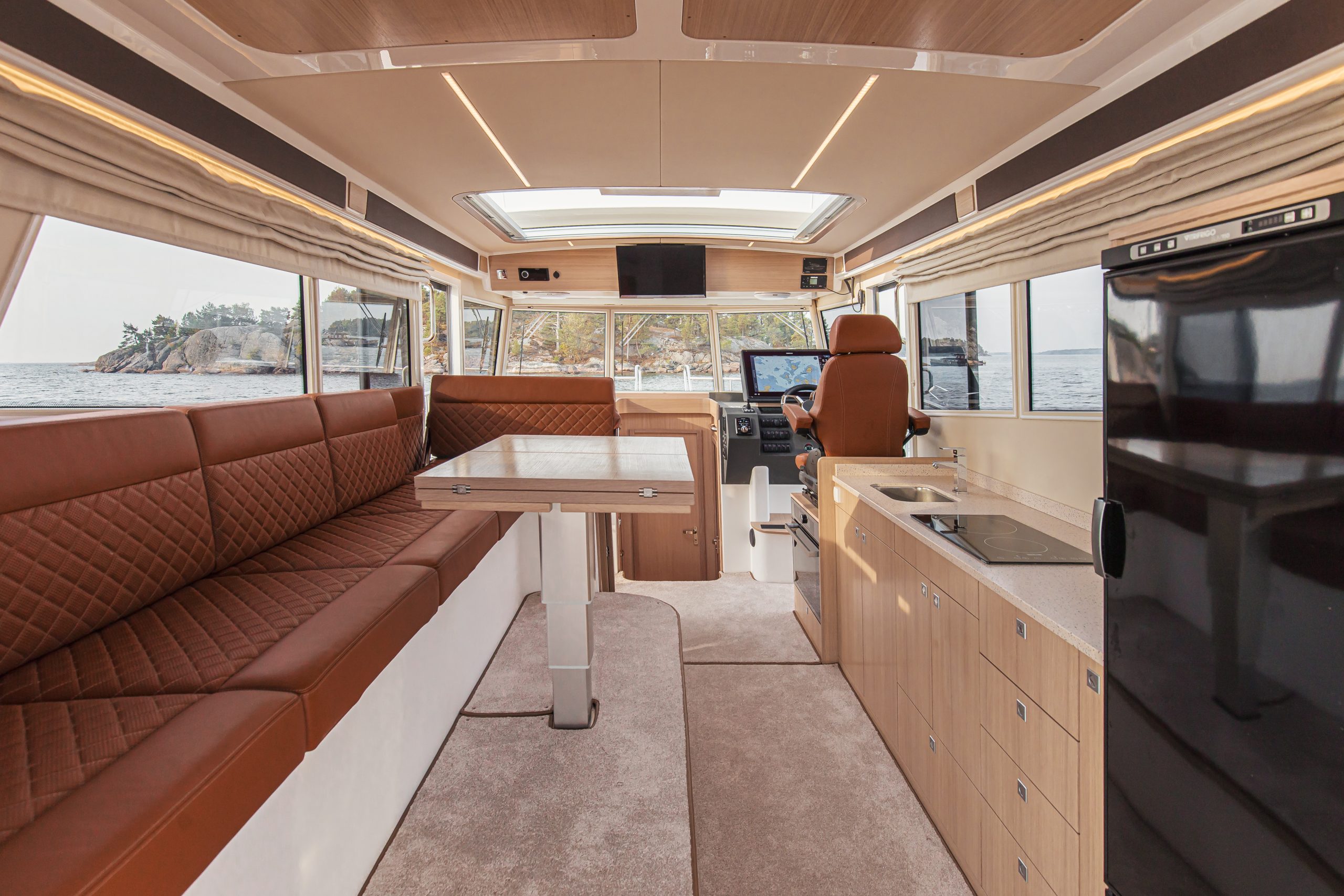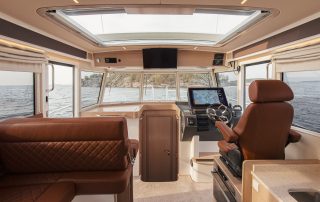 Das geräumige Achterdeck mit Sitzgelegenheiten und abnehmbarem Tisch bietet großzügigen Platz für Entspannung und Unterhaltung. Das Walkaround-Deck mit Handläufen sorgt für eine sichere und ungehinderte Bewegung rund um das Boot auf See oder in der Marina. Die Flybridge-Option bietet zusätzlichen Spaß während der Fahrt und weiteren unterhaltsamen Raum.