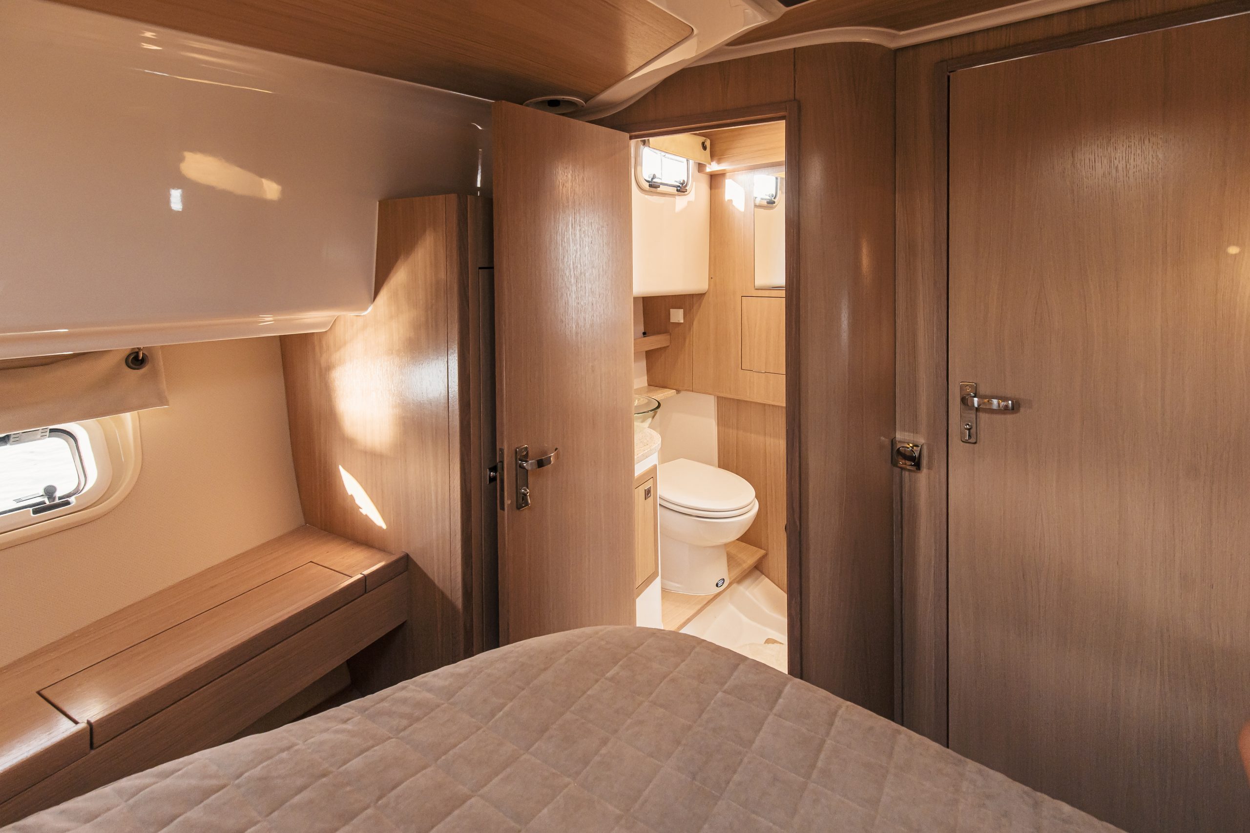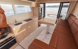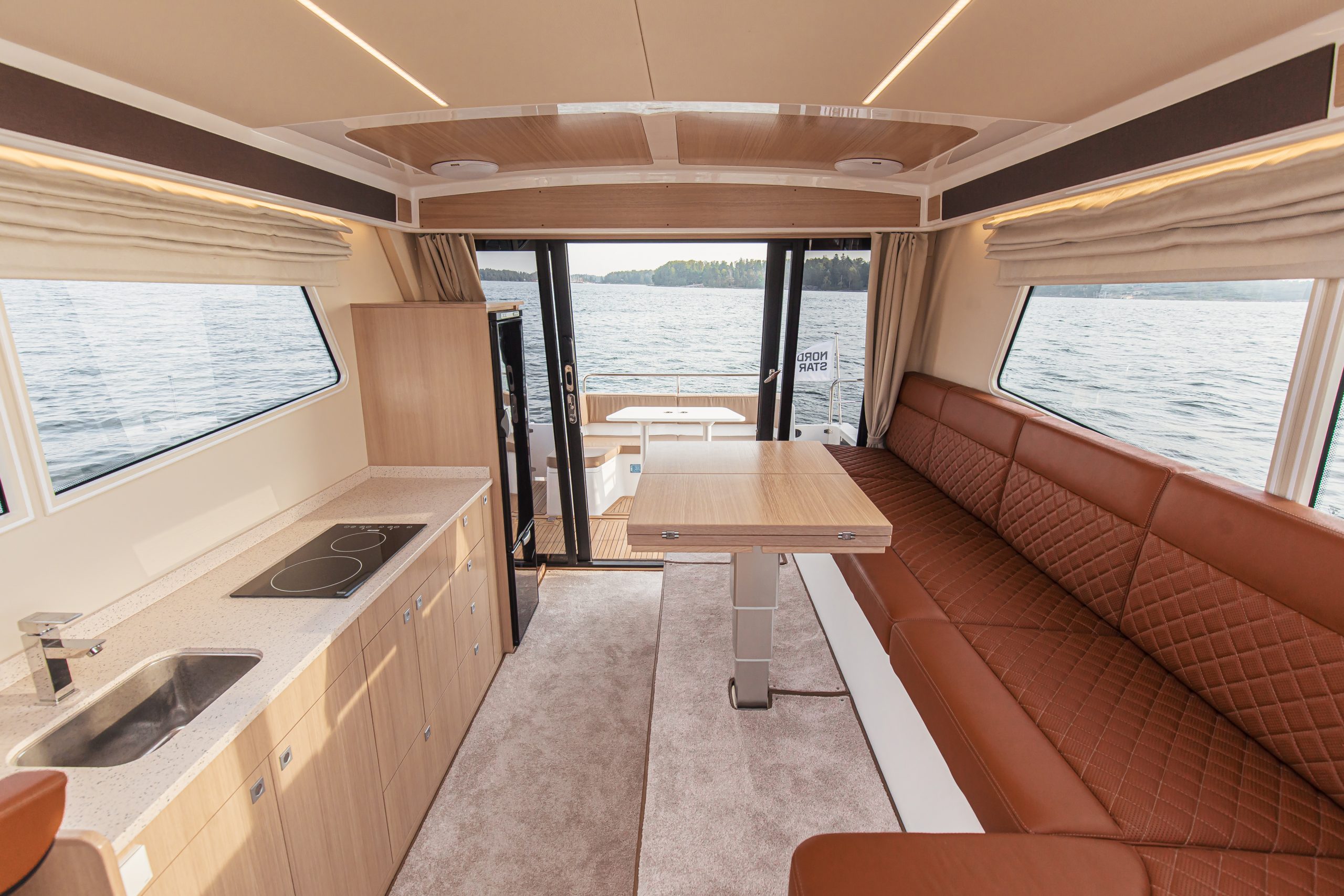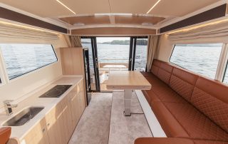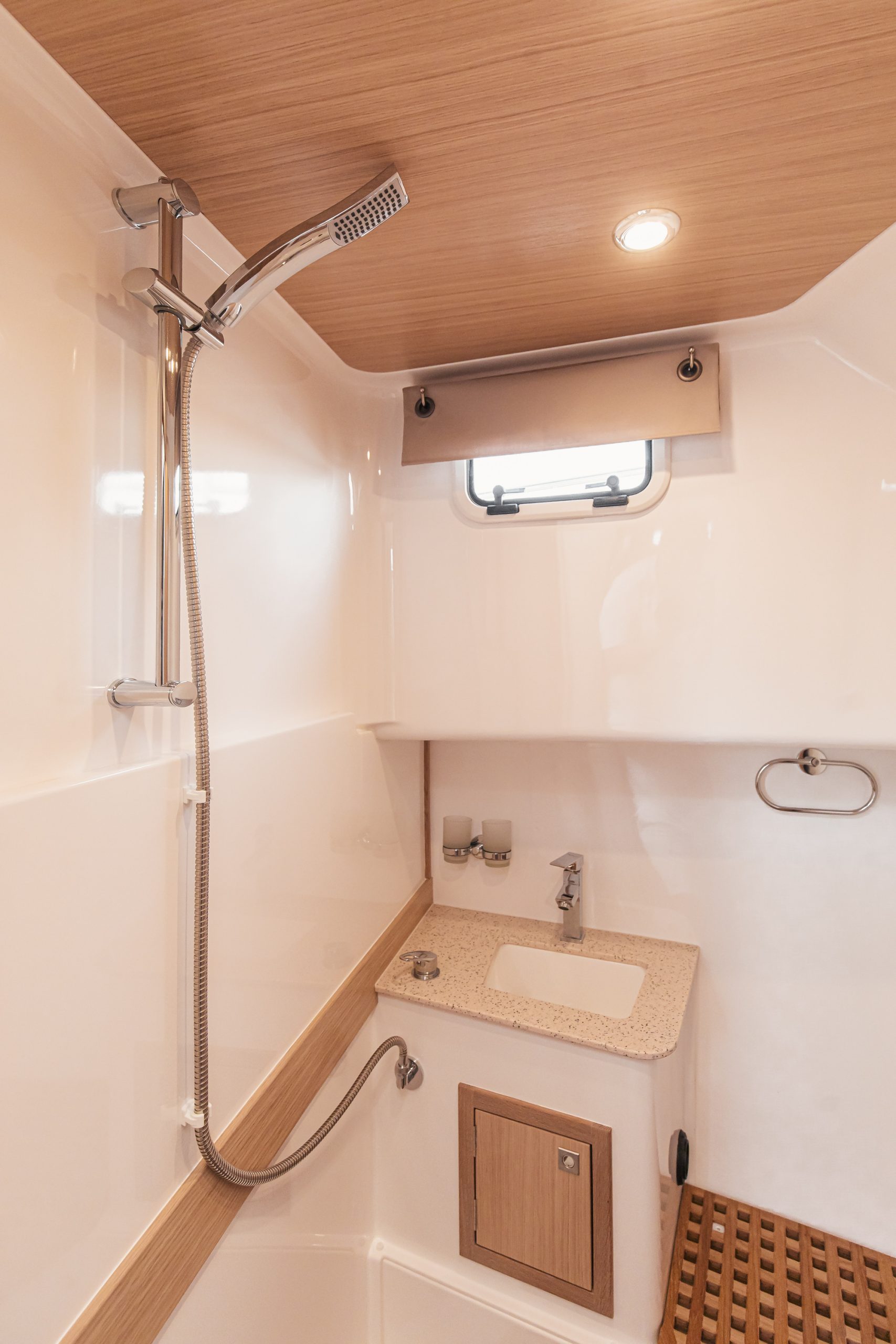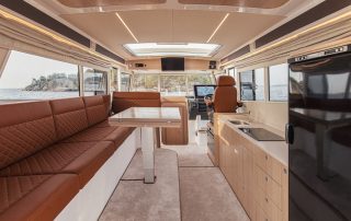 Das Leben an Bord der NS42+ ist luxuriös mit zwei separaten Kabinen, jede mit eigenen Toiletten und Duschen, und umfangreichem Stauraum. Die geräumige, moderne Küche neben dem prächtigen Loungebereich bietet Platz für persönliche Zeit und Geselligkeit.